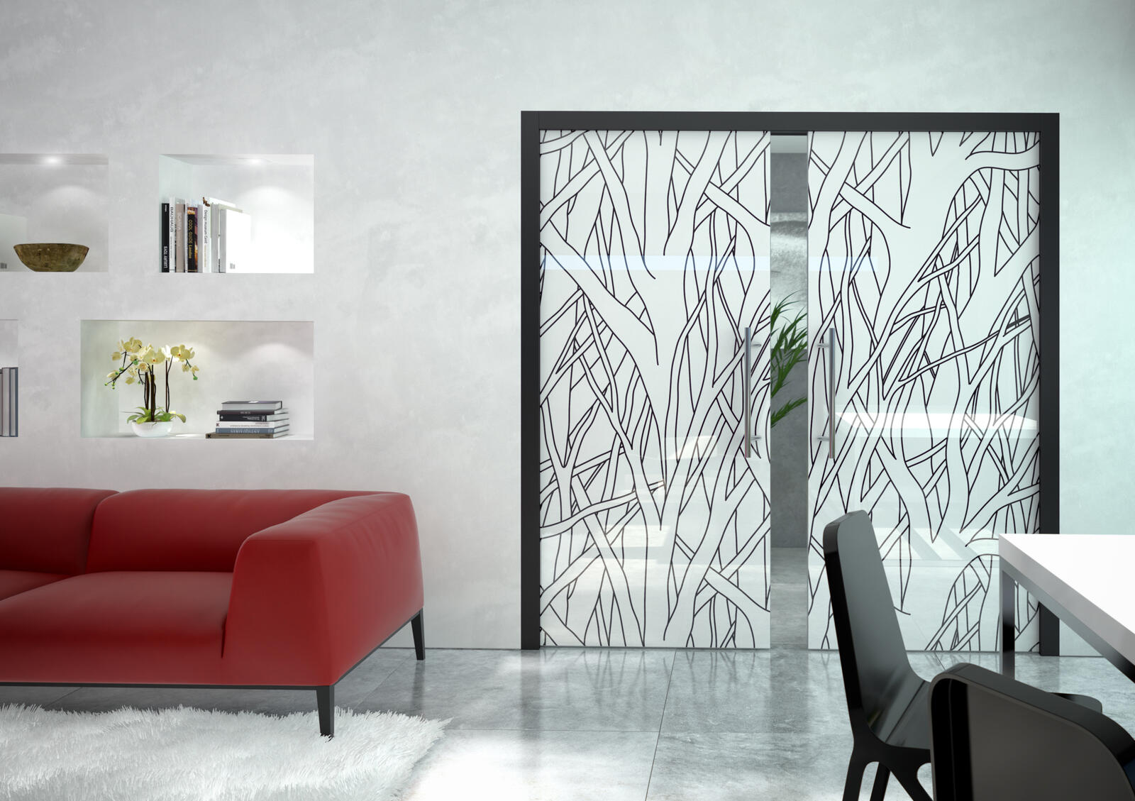 Дверной пенал в исполнении для двупольных сдвижных дверей, когда деревянный традиционный короб находится в одной плоскости со стеной, а таким образом и с контуром стены, и верхнее соединение деталей осуществляется встык. Движение полотен также может быть синхронизировано, в этом случае оба полотна могут закрываться или открываться одновременно. Данный дверной пенал обеспечивает возможность монтажа короба с наличником в одной плоскости с соседней перегородкой и предназначен для короба с наличником толщиной 15 мм. В случае перегородки из кладки строительный проем необходимо снабдить перемычкой — дверной пенал не способен нести нагрузку. По своему дизайну пеналы продолжают целостную линейку черновых коробов Latente для поворотных дверей.